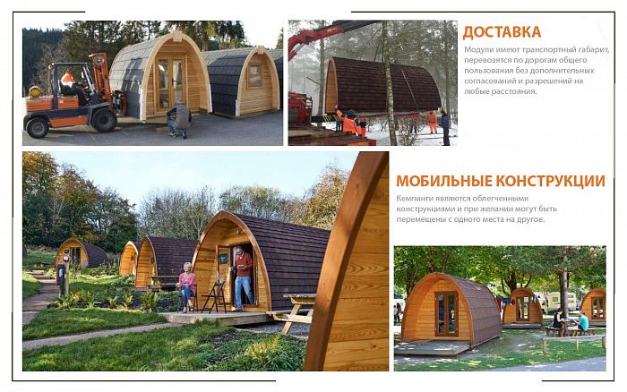 Кемпинги производятся из хвойных пород дерева. Крыша изделия покрывается мягкой черепицей, выглядит красиво, практично. Для того, чтобы эко-постройка сохраняла тепло в холодное время года и не нагревалась летом, используется утеплитель - негорючая базальтовая плита (100 мм). Окна, двери изготовлены из пвх-профиля с двойным остеклением. Стандартная комплектация такого строения включает всё необходимое для эксплуатации в теплое время года. В стоимость уже включены полки, вешалки, стол, кровать. В помещении есть свет. По желанию владельца кемпинга можно дополнить конструкцию выделенной кухней, сан.узлом, душевой кабиной или ванной. Очень частой дополнительной опцией является установка кондиционера, особенно она распространена при эксплуатации домиков на базах отдыха, в санаториях. Любой полет фантазии клиента реализуемый, так как компания Дары Кедра является производителем мобильных каркасных и бань-бочек. Чтобы мобильная конструкция была в эксплуатации круглый год, в ней нужно установить теплый пол или печь. Дополнительный уют и красоту домику придадут террасы, веранды, их можно использовать в качестве дополнительного пространства для организации беседки, гриль-площадки и т.д.