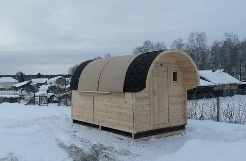 Приобретали такую буханку. Понравилось, что она более просторная, чем другие бани бочки. Привезли готовую и сразу поставили на подготовленное место. Симпатично смотрится, летом покрасим ее и вообще будет огонь)). Быстро топится, мы оценили.