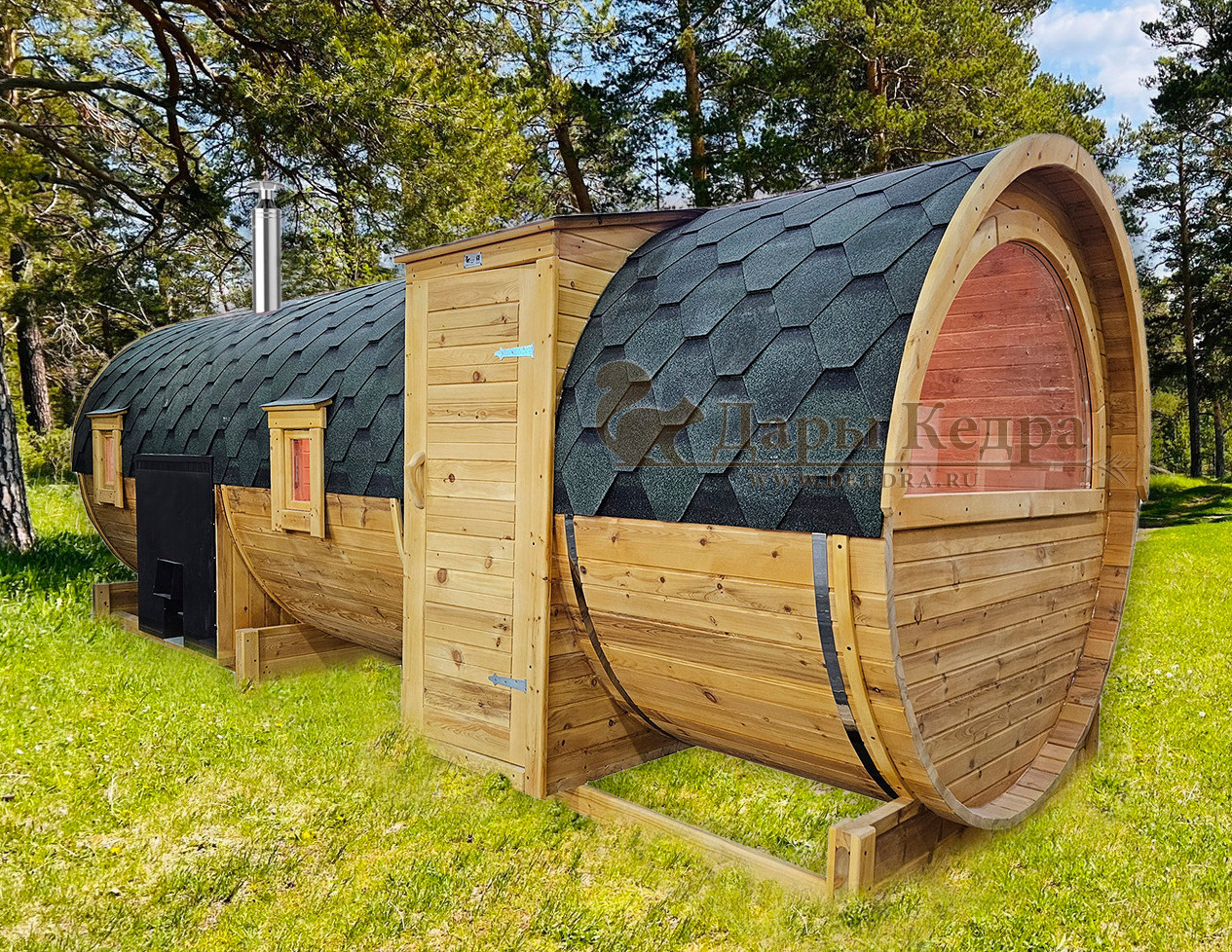 Баня-бочка «Орео» с боковым входом и панорамным окном Стильная и современная баня-бочка с боковым входом может быть выполнена длиною от 4 метров, что-бы было два отделения (парилка и комната отдыха). Полок может быть, как с двух сторон, так и угловой, в стандарте одноуровневый. Печь в данной модели расположена сбоку с топкой наружу, либо внутрь парилки. Печь можно укомплектовать баком для воды, а саму баню сделать длиною до 6 метров, комфортно разместив в ней дополнительно помывочную. В эту модель включено два закаленных стеклопакета: круглое и полукруг, которые мы можем разместить на ваше усмотрение в парилке и комнате отдыха. Обращаем Ваше внимание, по умолчанию в данной модели отсутствует бак для воды, вместо него идёт утеплённая термо-труба, которую можно заменить на бак по желанию.