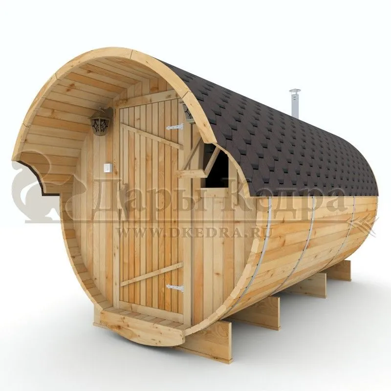 Это изделие круглой вытянутой формы. Козырек не только украшает баню, но и защищает оставленную обувь от дождя. Лавочки из кедра находятся по всей длине бани-бочки с обеих сторон. Печь расположена в парилке около дальней стены. Время растопки такой печи не превышает 30 минут. В зависимости от выбранного размера круглая баня-бочка с козырьком имеет следующую комплектацию: