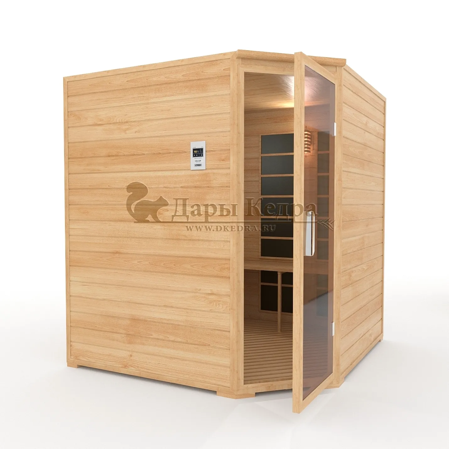 Это специально оборудованная кедровая кабина для прогрева тела человека сухим теплом. Воздух в таких парных не нагревается. Инфракрасные лучи воздействуют на тело, равномерно прогревая мышцы, суставы и органы. Карбоновые излучатели, встроенные в стены кабины, обладают мягким прогревом, что полностью исключает возможность ожога. Работает кабина за счет электричества. Установка сауны в угол, позволяет рационально использовать пространство помещения. Эта вместительная модель подходит для коммерции.