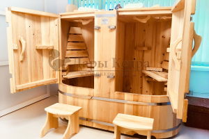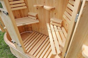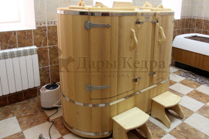 Двухместная фитобочка из кедра - это парная, в которой удобно принимать процедуры двум людям. Она оборудована откидными створками, дверцей, отверстием для головы и перегородкой (по желанию). Толщина стенок составляет 40-45 мм, что позволяет увеличить срок службы изделия. Во время парения человек находится внутри кедровой бочки, а голова снаружи. Благодаря этому исключается возможность перегрева. Подлокотники из кедра и внутренние ручки делают эксплуатацию фитобочки более удобной.